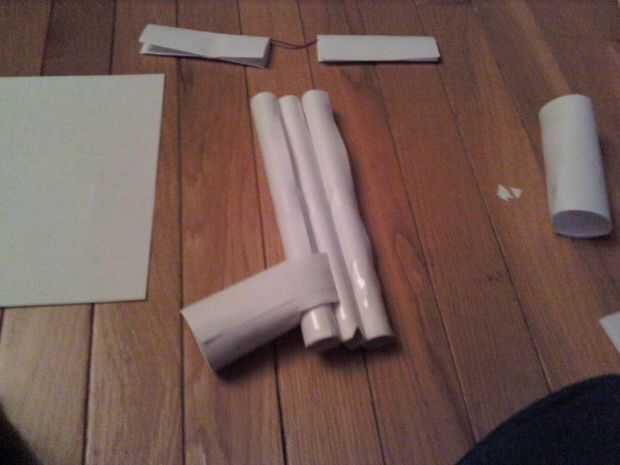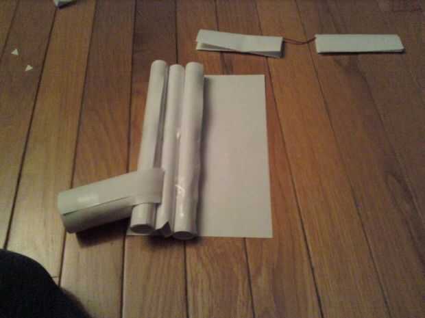Encinte la manija al 3 rollos. luego tomar la paz la mitad del papel y el Add 3 rodillos del mecinism de fuego en la parte posterior de la cubierta y añadir la goma a medio rollo. luego la cinta.