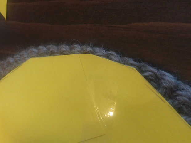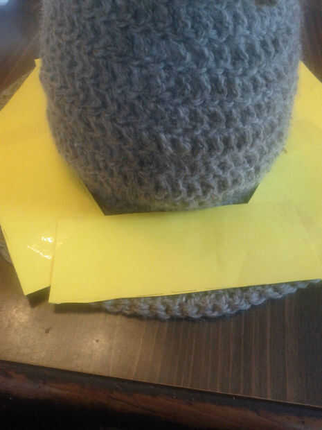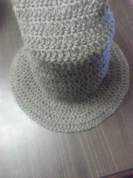 A continuación sacar el anillo de papel y sombrero de la jarra. Ganchillo donde izquierda apagado y hacer lo mismo solamente disminución en cada puntada 6 en lugar de aumentar. Después de unas pocas líneas pusieron su anillo de papel en el borde del sombrero y crochet sobre él. coser ambos lados de la llanta con un gancho de hilo o crochet junto con el documento en el medio.