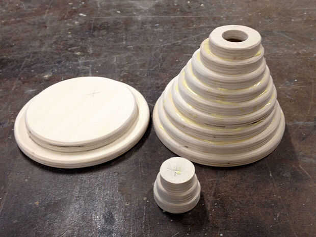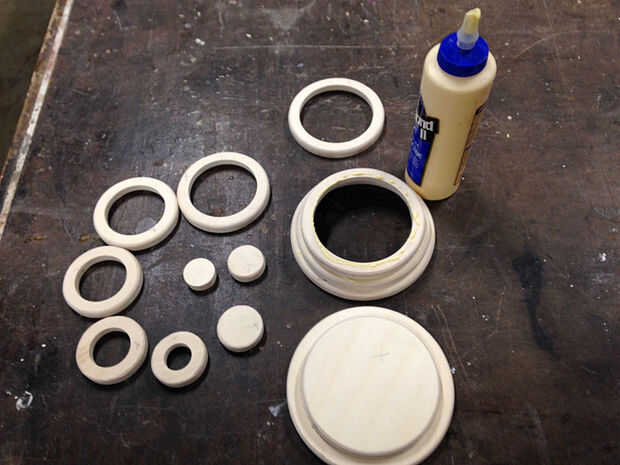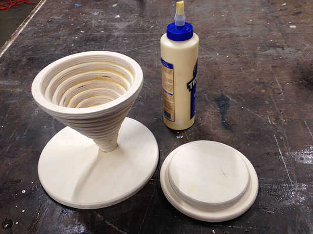Poner pegamento en los bordes de un anillo y pila el siguiente anillo en la parte superior. Pila de todos los anillos como este pero no coloque los círculos de la parte inferior. Pegar los 2 o 3 círculos pequeños que conforman la base por separado y pegar al círculo de la base donde quieras el tornado tocar. Pues estos a apoyar todo por encima de ellos necesitan un poco más refuerzo. Una vez que haya secado el pegamento, poner un clavo o tornillo en ellos para anclar a la base. Luego pegue el resto de la tornado.