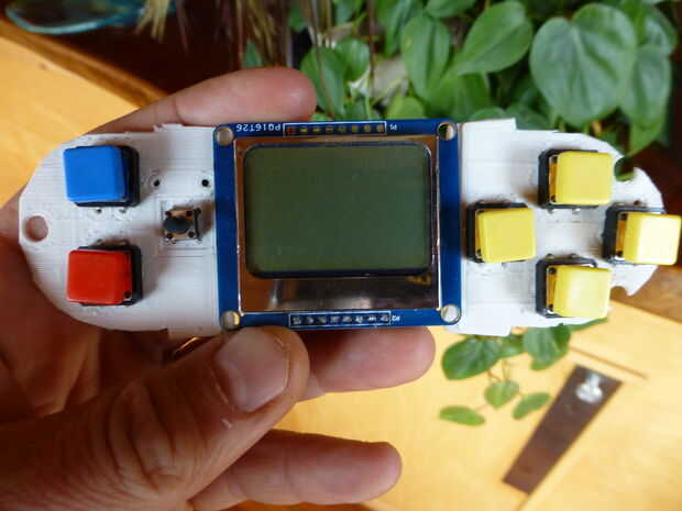 Aquí es una consola de juegos portátil retro que construí con mi hijo. Utiliza un microcontrolador de Arduino, una pequeña pantalla LCD, botones, caso impreso 3D y tablero de caseros "PC". Es realmente bastante fácil de soldadura y poner junto. Mi hijo y me escribió dos juegos y un programa de dibujo para él. Ver el video para una rápida demostración. ¡ Disfrute!