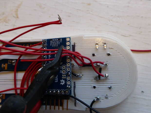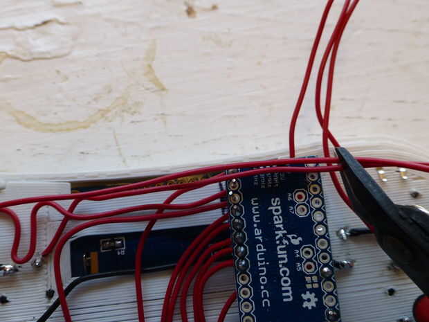 4. Encamine los alambres de rojo de la izquierda y botones de la derecha para recortar, tira y dóblelos para encajar en los pines 10 y 11 en el otro lado de la Arduino. No de la soldadura de estos pero como es más fácil soldar todo de una vez del otro lado.