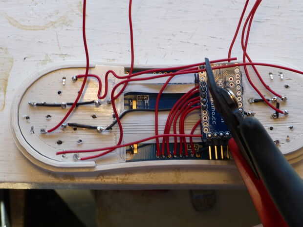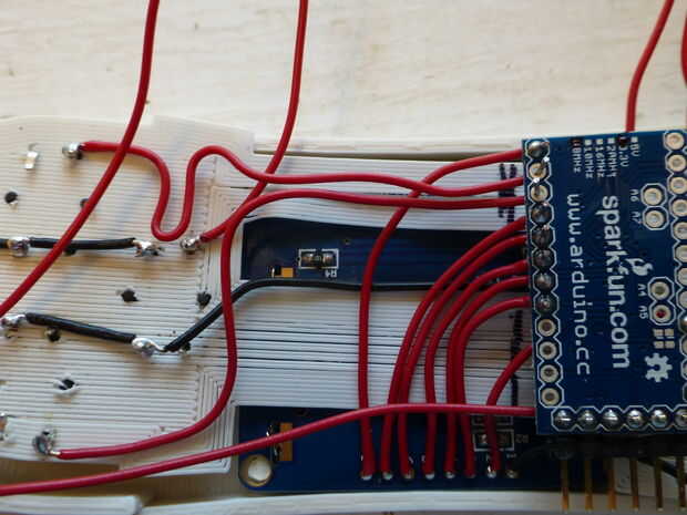 3. Encamine los alambres de rojo de arriba y abajo los botones para que puedas recortar, tira y dóblelos para encajar en los pines 7 y 8 de la Arduino. La soldadura de estas en el lugar. Ver foto.