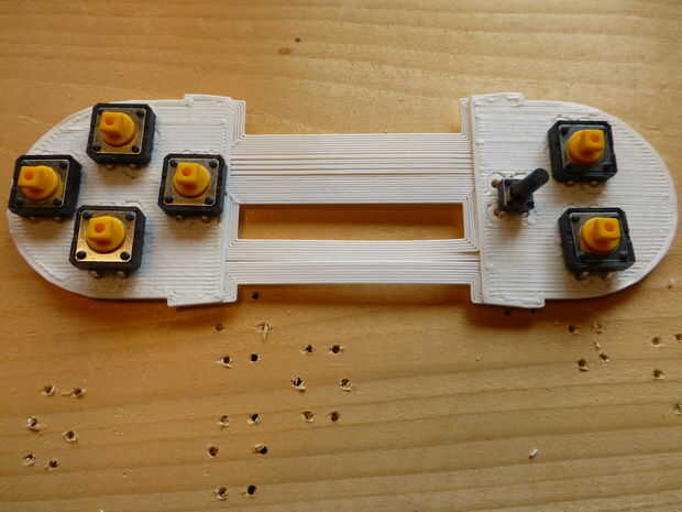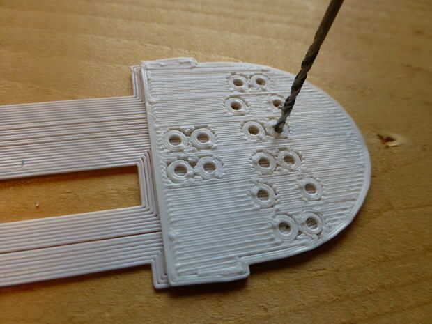 Este proyecto fue y experimento para mí hacer un 3D montaje impreso para las diferentes partes en lugar de tener que tener un tablero estándar de la PC con el grabado hecho. Se sentía como había pocos suficientes conexiones que sería bastante fácil de soldar con alambre simplemente como había un esquema de apoyo decente. Lo importante era obtener todos los botones en un lugar fijo para no moverse al usar el magpi. Porque impresión agujeros pequeños es complicada (es decir, no precisa) con nuestro Printrbot Jr. V2, lo que hice fue dejar la capa de fondo de la impresión sólida y luego perforar a través de él con una broca de 1/16 bit (ver foto). Después de perforar los orificios Introduzca un botones de un Asegúrese de que el asiento bien.