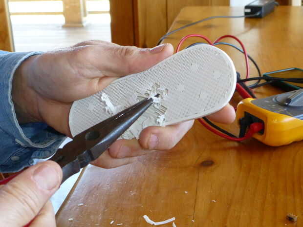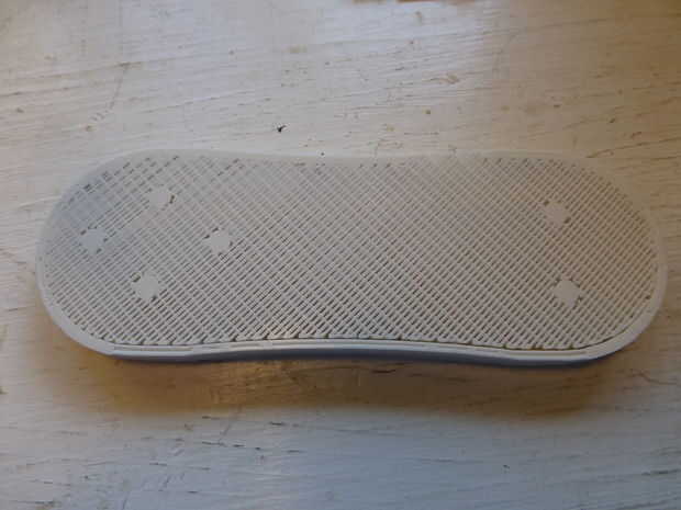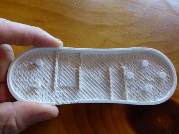 Limpie el material de apoyo en el caso superior. Comenzar pasando un cuchillo alrededor del perímetro para limpiar el material de apoyo de los bordes. Use alicates de punta para quitar el material de apoyo. Tenga cuidado al sacar el material de apoyo no a la presión del botón respaldo apoya. Puede que necesite utilizar un destornillador de cabeza plana para raspar los últimos bits de material soporte. Esto es más importante en las áreas donde la batería, cargador y Arduino ir así que cupieron. (Ver fotos).