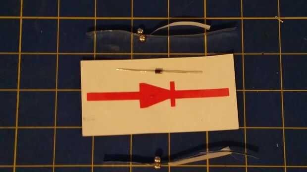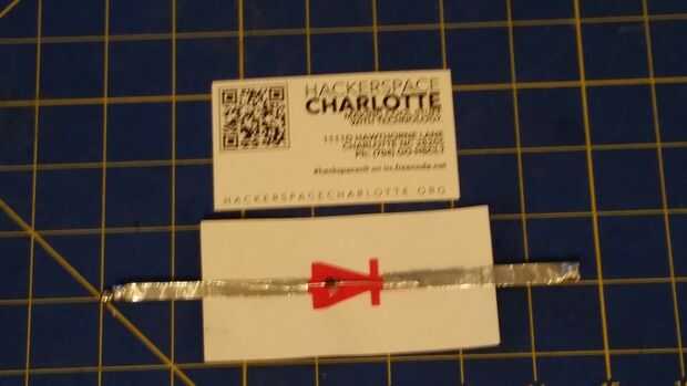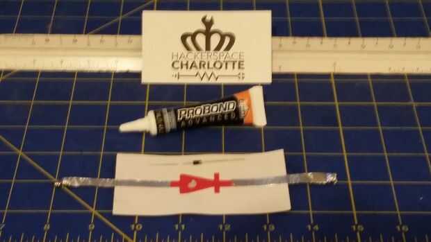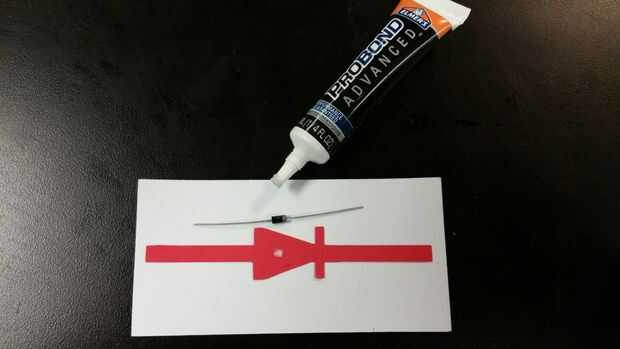 Siguiente un blob de ProBond avanzadas Elmer! Colocado el componente sobre ambos extremos tocando la parte superior de la cinta de papel. Coloque la cinta de aluminio más sobre presionado el componente a sus respectivas finales.