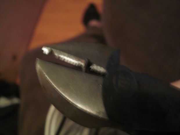 A continuación tome sus conjunto pinzas y agarra el remache para que un extremo es en la hierba con el apretón suave presión cerrar la pinza. Esto debe comprimir la marquesinas longitudinalmente causando que se hinche a cada lado del agujero, dejando una protuberancia plana en la parte inferior y una cúpula en la parte superior.