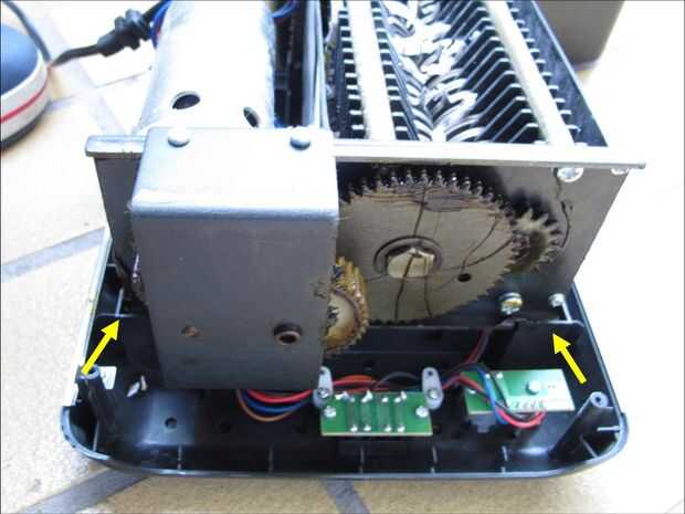 Recuerde la posición de la Asamblea de la máquina destructora de documentos dentro de la cubierta. Tienes que volver a colocar el conjunto en exactamente el mismo lugar cuando poner todo de nuevo juntos.