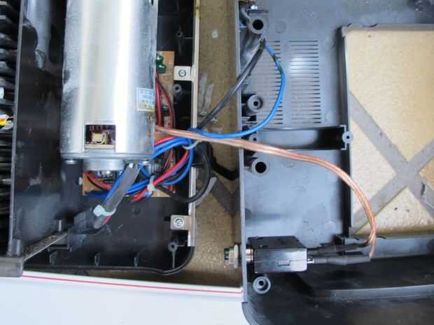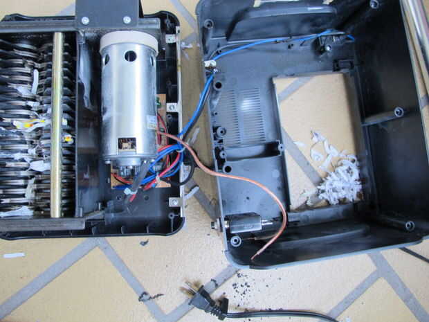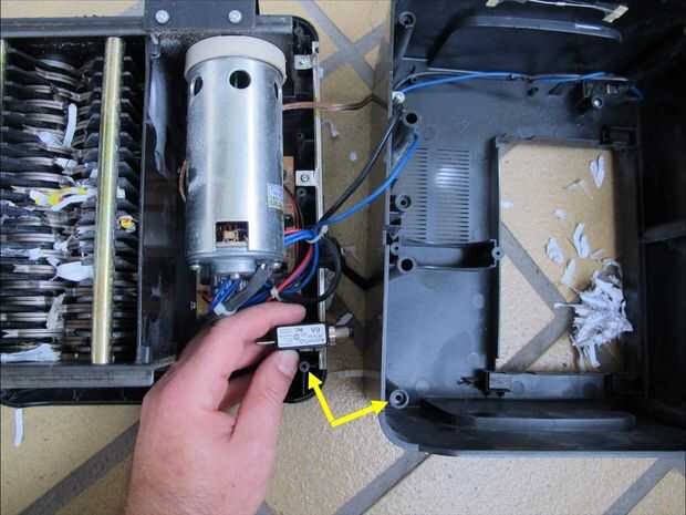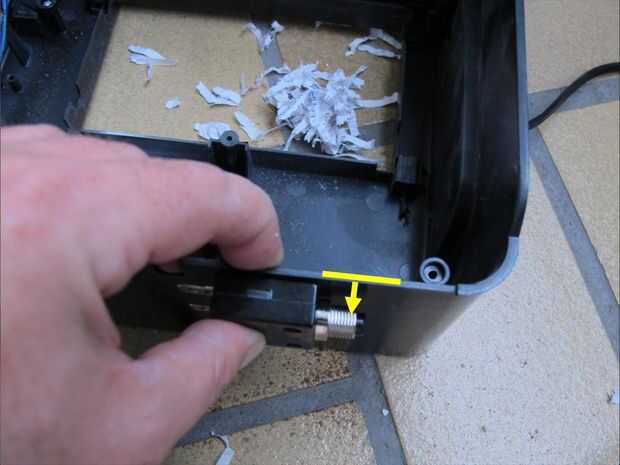 No se puede instalar al interruptor completamente a la todavía porque las diapositivas de la unidad de máquina destructora de documentos a la basura bin vivienda. Así que primero hay un corte en la cubierta del cubo de basura para acomodar el hilo del interruptor de circuito.