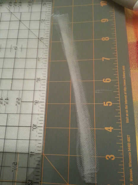 #9 siguiendo el mismo procedimiento (que utiliza para alisar el borde irregular de la tul) mover su borde recto exponiendo la cantidad de tul para el ancho que quieras tus franjas de serlo... en mi caso era 3 pulgadas.