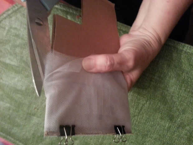 #3 una vez que tengas varias tiras de tul envuelto alrededor de la cartulina. Mantener el tul con un clip y deslice el punto de su tijera en el extremo de la cartulina y cortar el tul. Repita para el otro extremo. Ahora tienes tus franjas cortadas... Es fácil y una fracción del costo del pre-corte rollos de tul.