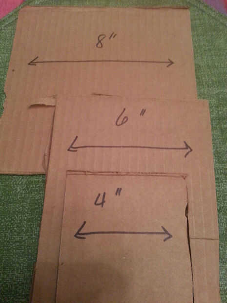 #1 que cada pieza se dobla por la mitad, así que corte pedazos de desecho de cartón en tiras de 8 pulgadas, 6 pulgadas y 4 pulgadas de largo. Hacer su cartón doble de la longitud que desea tus franjas que