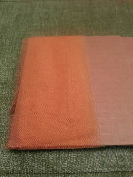 #2 envolver el tul las tiras alrededor de la longitud solicitada de cartón... teniendo cuidado de no estirar el tul. Alinee el primer borde del tul de la parte superior de la cartulina. Si necesita usted puede utilizar un pequeño trozo de cinta o un clip (lado) para sujetar el tul en lugar... Continúe envolviendo. Corte cualquier exceso que tienes.
