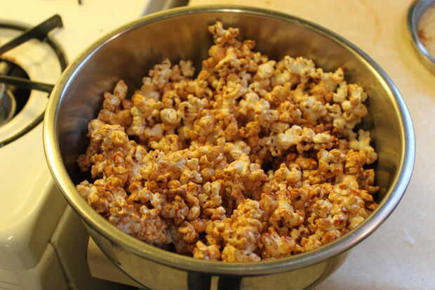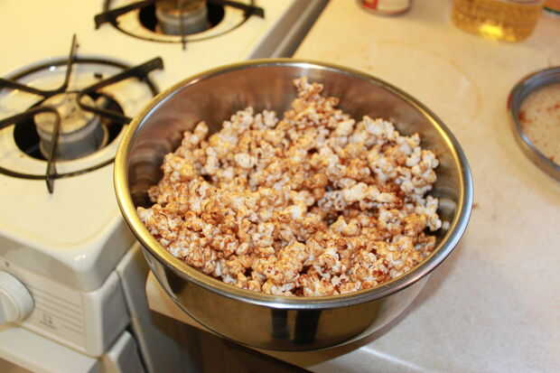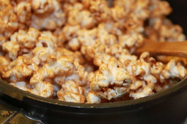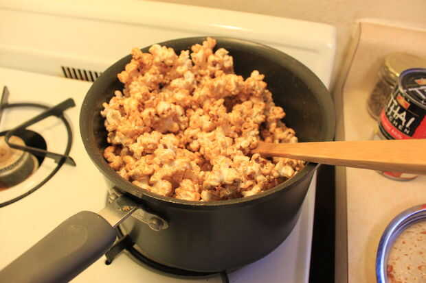 Agregue las palomitas de maíz alrededor de distribuir el caramelo uniformemente como sea posible