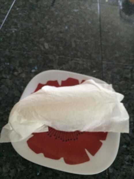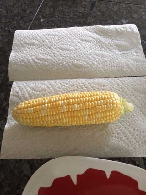 Envuelva la toalla alrededor del maíz, si usando dos hojas de toalla de papel luego pone un debajo y uno sobre el maíz