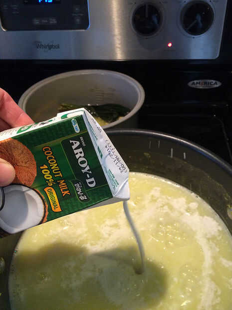 Siguiente paso, verter el líquido en una olla y hervir con fuego medio-bajo y revuelva con frecuencia. Cuando la leche maíz arranque el hervor, agregar una taza de crema de coco (o leche de coco) y una taza de leche entera (leche descremada vale también), algunos pedazos de roca azúcar o cualquier edulcorante como su prefieren.