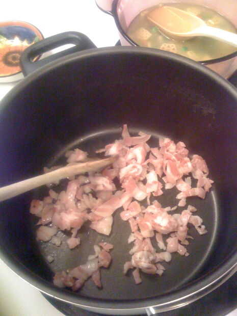 Picar la panceta en tiras pequeñas. Cocinar a fuego medio en una olla durante 2-3 minutos o hasta que esté crujiente.