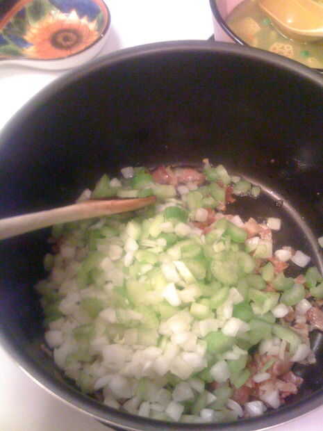 Añadir el apio, el ajo y la cebolla a la olla. Revolver y cocinar hasta que quede suave pero no dorada (4-5 min.).