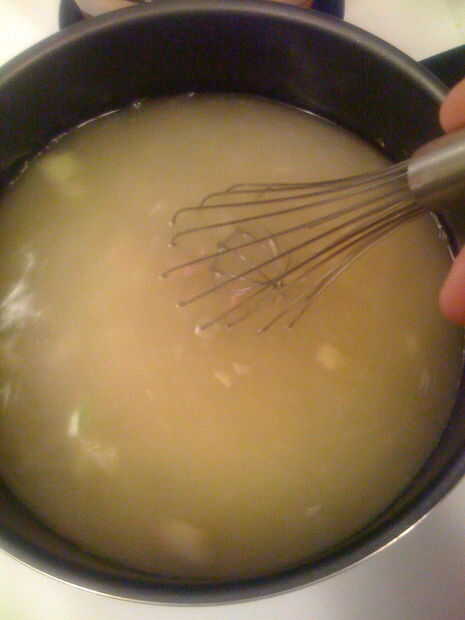 Agregue el caldo de pollo con un batidor para mezclar la mezcla de harina y el líquido.