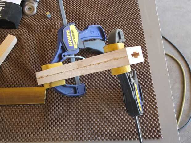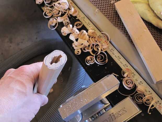La manija se hace de arce duro. Empecé con dos mitades, para montar sobre el perno de montaje y deslice firmemente alrededor de la espiga acanalada. Las mitades eran pegadas y luego perfiladas para encajar mi mano. Encontré que un perfil oval es mucho más cómodo para mí que una forma redondeada. De todos modos, yo sólo seguí dando forma hasta que se sintió bien en mis manos (mira para el grueso de todo el tiempo, por supuesto).
