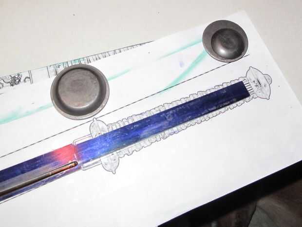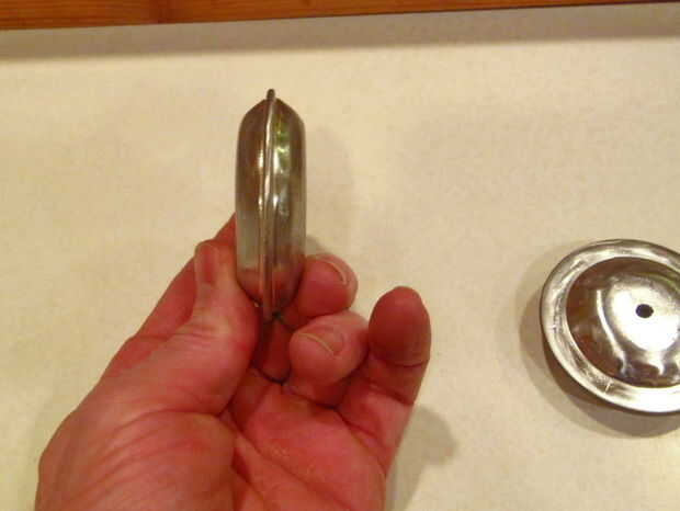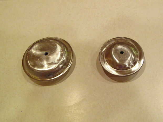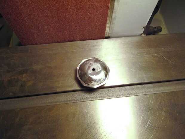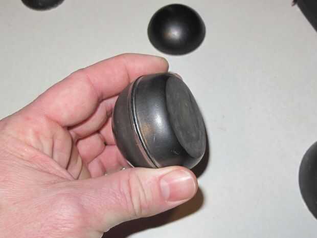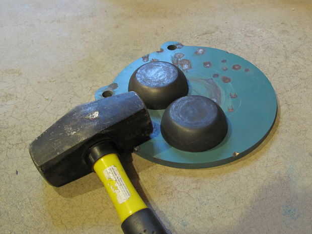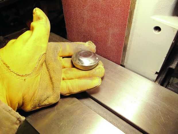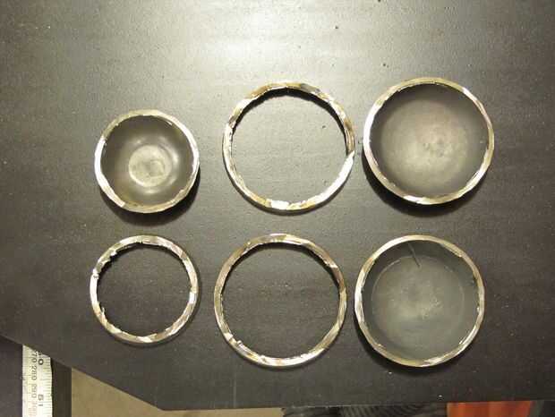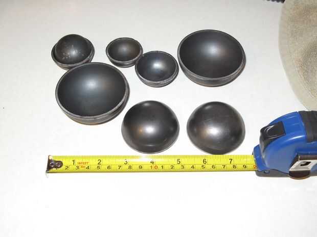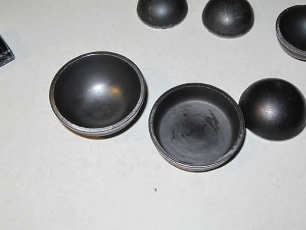 Ned envía los discos de óxido negro y cúpulas hacia mis manos poco caliente que sistema tratando de averiguar cómo dar forma a lo que quería. He probado usando una prensa de taller de 30 toneladas para aplanar las cúpulas - pero las cúpulas básicamente se rió y apenas se movió. Por curiosidad, probé un trineo de 2 libras para ver si podría conseguir una forma bien controlada - y como la suerte lo tendría, que trabajó muy bien. Como el sorteo de presentación de la hoja, superando a los pisos en las cúpulas fue un poco de trabajo, pero de alguna manera satisfacer. Usted puede hacer el proceso menos tedioso imaginando que la cúpula es alguien que no le gusta (jeje).