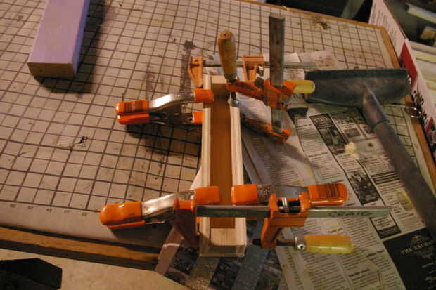 Opté por hacer una caja para recibir el poste. Utilicé un cuadrado de 7 pies 1/1/2 en placa para el polo. Salí de la Plaza de polo donde encajaría en el cuadro y planeado la Junta a una ronda debajo del cuadro. En la foto donde estoy pegando el cuadro, una de las piezas dentro de la caja es sólo un espaciador, que quitar ya que el polo necesita ajuste. El otro se pega en actuar como una parada para el poste. Pega y tornillo de la caja del poste en el cráneo. Puse la caja en la parte frontal del cráneo con la esperanza de equilibrar el peso de la persona que le.