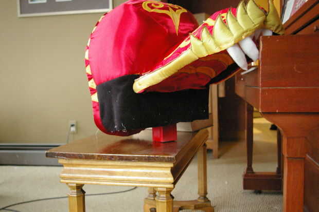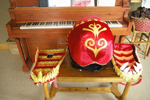 Las mejillas están hechas de varias piezas. Hice formas me gustaba y cubierto con tela y cosido. Dos de las piezas se hacen de la aislación de techos con cubiertas de cinta del conducto. Los cuernos amarillos son de tablero de aislamiento del techo, alambre, 1/2 pulgada tapizado espuma y envueltos en cinta adhesiva. He añadido el cable para evitar que se rompa. Alambré los pedazos de mejilla y de cuernos a través de los tejidos y en la caja.