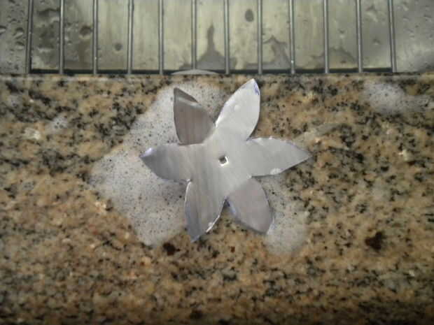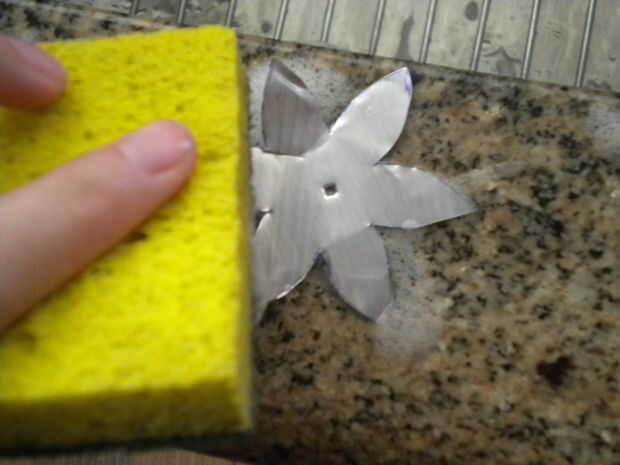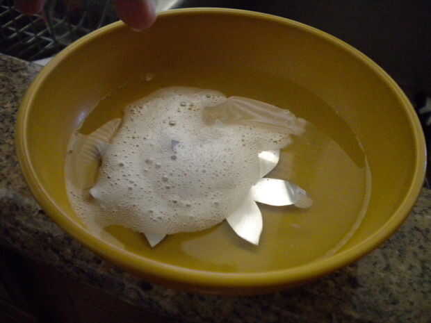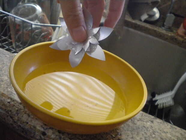 Ponga el detergente en una esponja húmeda y friega lejos del centro de la flor sobre una superficie dura. Esto limpia la tinta así como para ayudar a aplanar la flor.