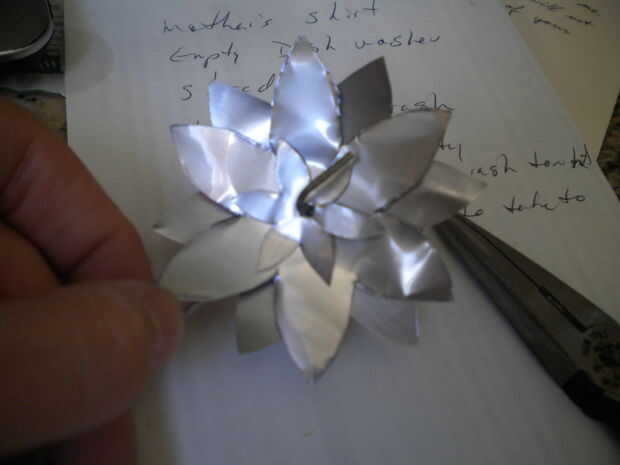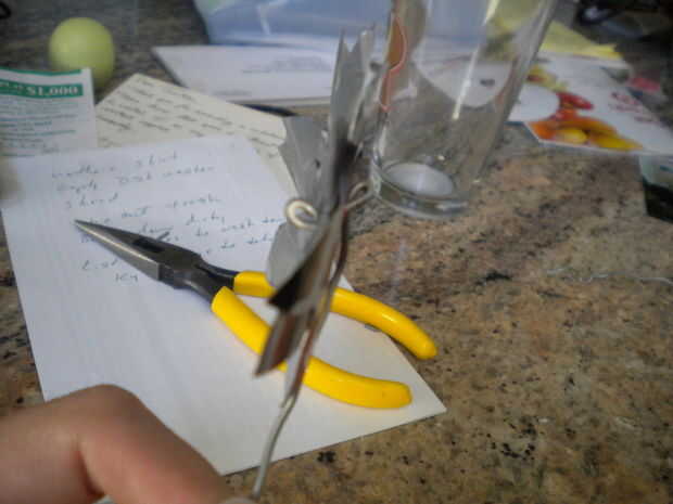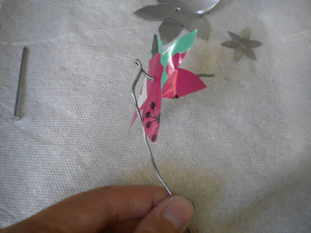 Curva el alambre para arriba para que no se salen. Hacer un segundo lazo para cerrar el final. Si quieres hacerlo girar en el viento, que el espacio entre los lazos afianzados con abrazadera más. Clip el exceso de entonces fijar apagado el bucle. Esta parte requiere cierta habilidad pero es muy fácil.