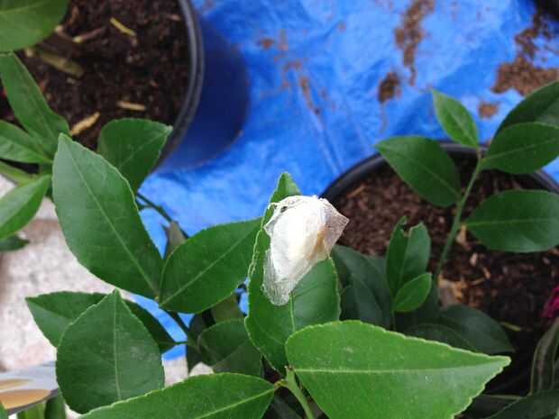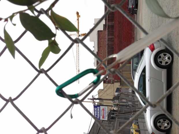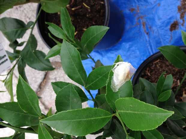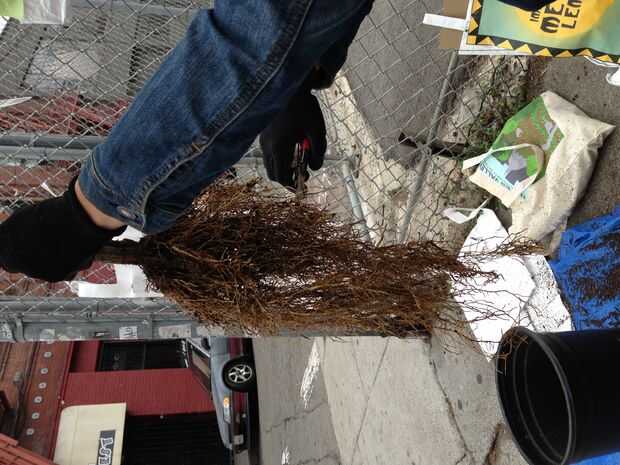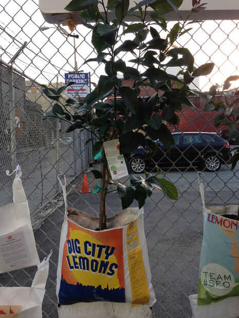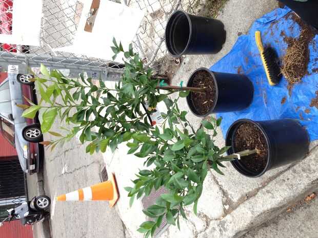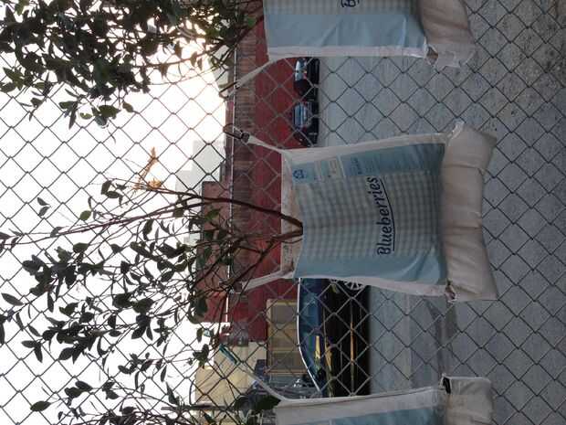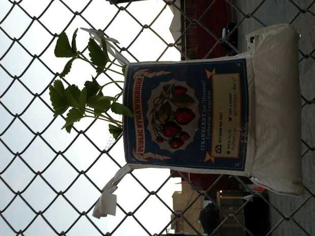 Clip de plantadores de fruta cerca a cercas de la ciudad. Estas bolsas han sido diseñadas para apoyar plantas frutales más grandes, del tamaño de un arbusto pequeño. Un depósito interno de agua ayuda a extender la cantidad de tiempo entre riegos. Dependiendo de la planta, el clima y la construcción, el depósito de agua puede hidratar la planta durante 1 a 3 semanas.