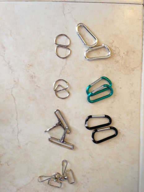 Una tienda de camping-reparación fuente es donde conseguimos nuestros mosquetones, pero si estás haciendo un montón de bolsas, pedidos en grandes cantidades podrían tener más sentido. Los más pequeños mosquetones de metal soportan alrededor de 30-40 libras de peso. Anillos en D son útiles para insertar las lengüetas, pero necesita para asegurarse de que no se tuerza, porque de lo contrario se estiran bajo el peso de las bolsas.