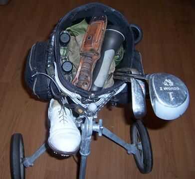 Un carrito de golf $2,00 es realmente más eficiente en su equipo a través del quinto pino que de carros juego de $159,00 de Cabellas de balanceo. El carrito de golf pesa diez libras y puede ajustarse para correr por un sendero de 12" de ancho. Un carro del juego Alum-i-Lite® pesa 28 libras y requiere un camino de 24" de ancho.