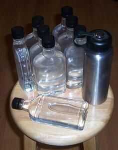1. suministro de agua (1 galón): un cuarto en una botella de agua de acero inoxidable. Tres cuartos de galón en ocho claro botellas de vodka del frasco de la cadera de plástico "pinta". Una persona normalmente necesita 1 galón de agua por día, pero el peso es un factor limitante. Mi fuente de agua deben actualizarse diariamente. Las botellas de frasco son ideales para la purificación de agua SODIS. Aprender sobre SODIS en http://www.sodis.ch/methode/anwendung/index_EN
