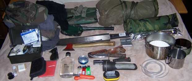 10. campo herramientas: Ka-bar Enfundadora de cuchillo con piedra sheathe y afilado. Multiherramienta Leatherman. Pinzas de Small Vise-Grip®. 4" navaja de bloqueo. Plegable de sierra. Hacha de guerra. Machete.