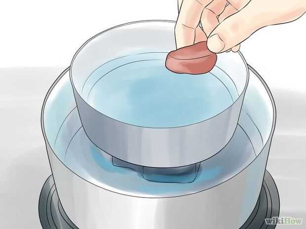4. crumble pequeños pedazos de cera en la cacerola pequeña. Puede utilizar cera de abeja o parafina en una tienda de hobby, o quitar la mecha de velas usadas y utilizarlos. Crumble o corte la cera en pequeños trozos para que derrita más rápido, luego echan en la sartén más pequeña. [Asegúrese que hay suficiente cera para cubrir las manos].