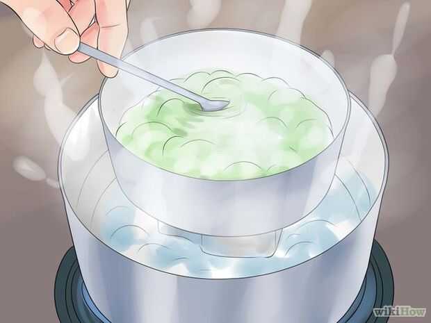 5. calor y revuelva la mezcla hasta que la cera se derrite completamente. Colocar la caldera de doble instalado en la parte superior de la estufa y el calor a fuego medio. Revuelva lentamente y constantemente con un utensilio de acero o de aluminio. Si la cera no es alimenticia, este utensilio también no será adecuado para cocinar. Esto puede tomar bastante tiempo, especialmente si la cera está en trozos grandes. Nunca descuide la cera mientras se calienta.