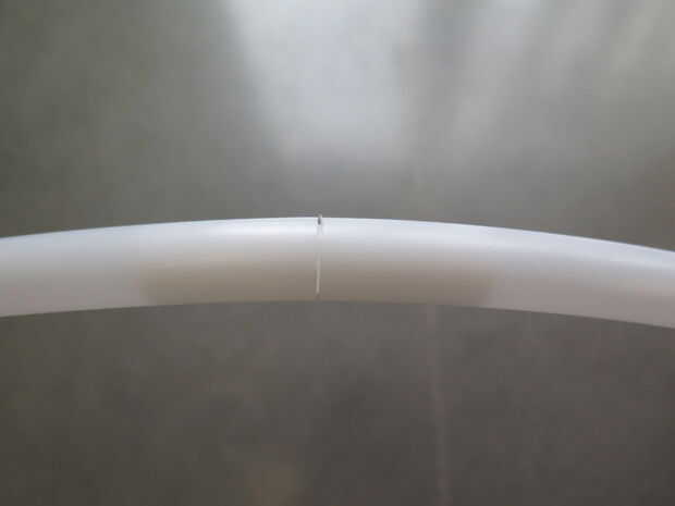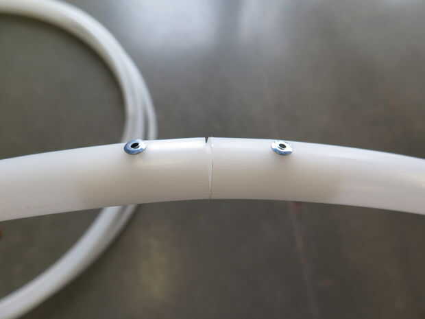 Luego perforé dos agujeros en la parte exterior del aro, uno a cada lado de la línea de costura, para asegurar el aro juntos.