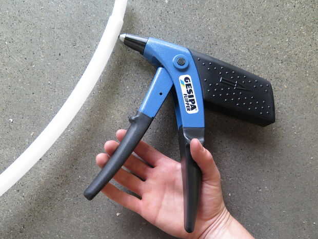 Salir de sus remaches y remachadora, inserte los remaches y a la manivela hasta que salga el remache en lugar. Asegúrese de mantener cierta presión sobre el remache como vas, de lo contrario puede deformar el área alrededor del remache. Si nunca ha utilizado estas herramientas antes, recomiendo probándolo a sentirse cómodo con él primero.