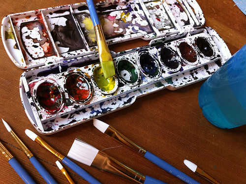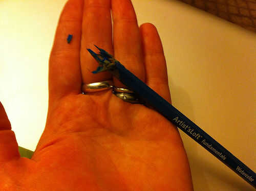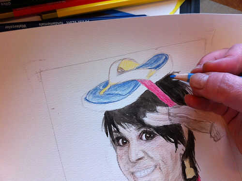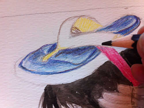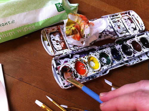 Usé algunos lápices de acuarela para el flip-flop en una cinta porque no tengo ninguna pintura acuarela magenta o cyan. Para el registro, rojo y azul no son colores primarios. Tuve algo no arranca un Santo de la guerra en los comentarios, pero... no te cian o magenta de la mezcla de otros colores de pigmento. Si no me crees, mira los cartuchos de tinta de impresora de color. No son rojo, amarillo y azul; son magenta, amarillo y ciánico (y negro generalmente). Lapices acuarelables funcionan de manera similar; todavía se puede mezclar con agua en un plato, o ligeramente puede frotar el lápiz sobre el papel de acuarela con textura, luego agregue el agua con un cepillo para alisar hacia fuera las partículas de color soluble del agua. Mis lápices de acuarela fueron $5 para un conjunto de 26 en la tienda de artesanía. No pague más por ellos porque mis hijos comen a veces.