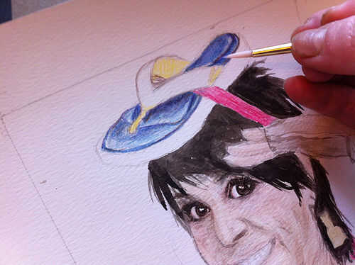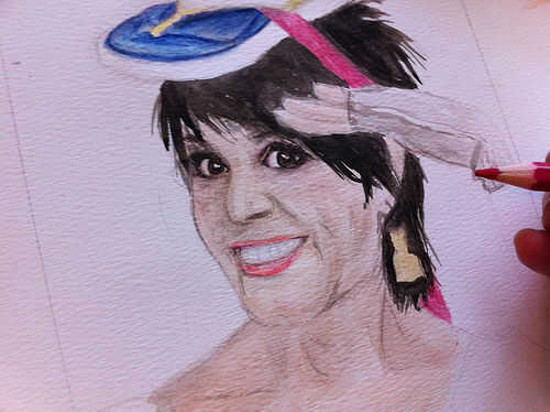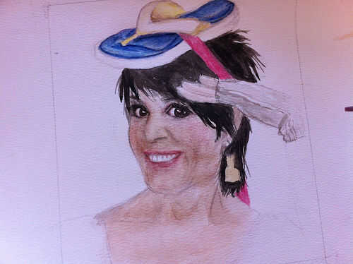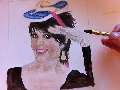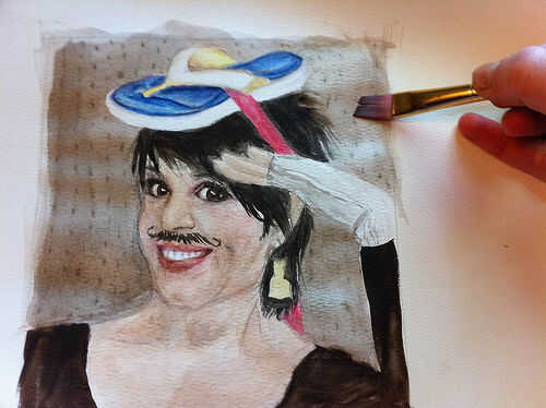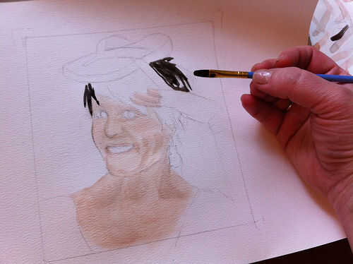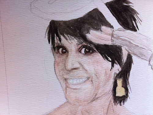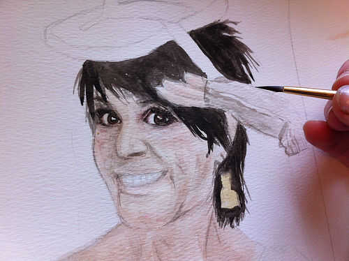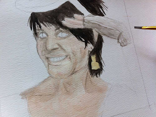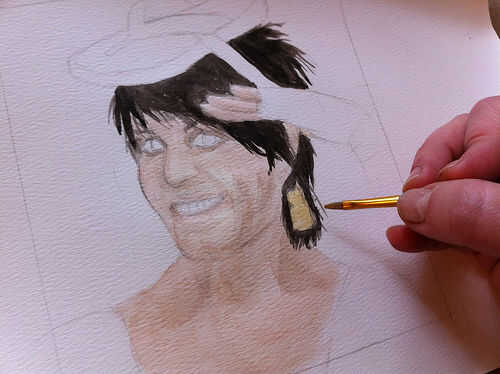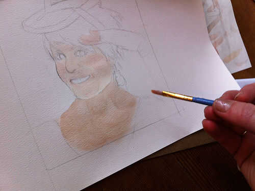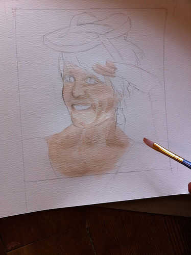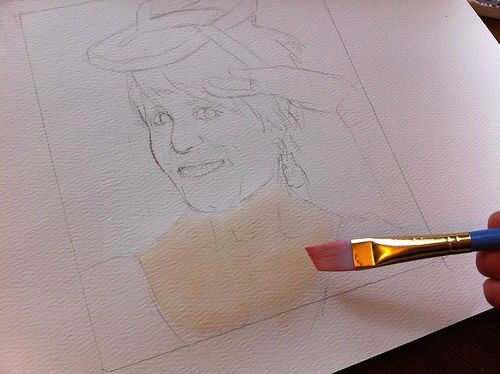 Por lo que he visto, acuarela se realiza con varias capas de color de la luz en capas encima de la otra. Primero pinté la cara con la capa (más acuosa) más ligera de color. Es difícil ver qué color la pintura acuosa se en el papel cuando está en un pequeño plato de plástico, así tendrá una toalla de papel u otro papel de desecho cerca para probar el color con un golpe de su cepillo. También ayuda a limpiar la brocha si no quieres hacerlo por goteo en su pintura.