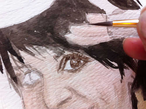 Usé un cepillo pequeño y comenzó con un Aguado café oscuro cuando pinté los ojos, porque quería dejar espacio para hacer algunas partes más oscuras. Si te fijas bien en fotos de personas, se dará cuenta de muchos tener una reflexión de la luz en sus ojos, generalmente en el iris o la pupila. Que parte es mejor dejaron blanco, así que asegúrese de pintar cuidadosamente alrededor de él. Los ojos tienden a ser viejo y cansado al empezar a pintar los detalles a su alrededor. No te preocupes a pintar las líneas más verlo. Después se añaden los detalles, oscurecimiento de zonas como las esquinas de los ojos, las pestañas, la pupila y el delineador de ojos (si la persona es que lo usa) equilibran la imagen y hacen los ojos lucir más joven otra vez.