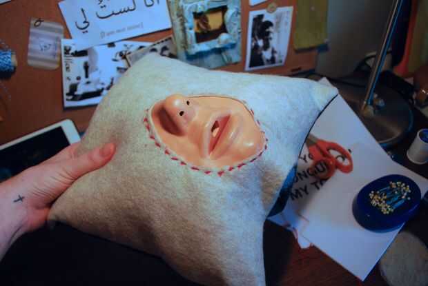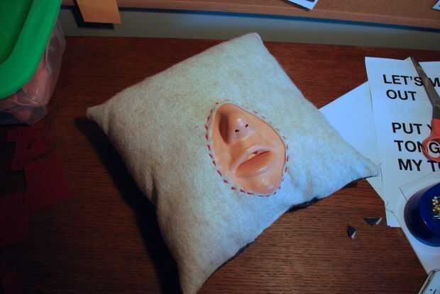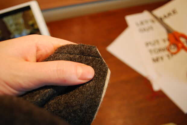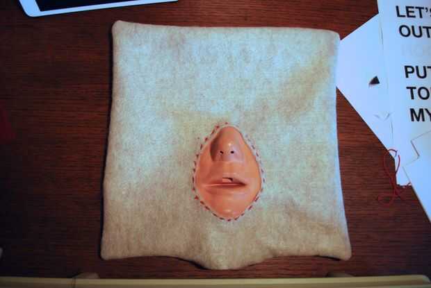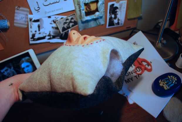 Con la boca de goma dentro, prender el fieltro cuadrado con la cara a la otra plaza de fieltro. Deje un espacio para dar vuelta el relleno de la almohada. Yo uso dos alfileres para marcar donde quiero mi espacio para que recuerde cuando yo estoy rugiendo a lo largo en la máquina de coser.