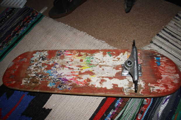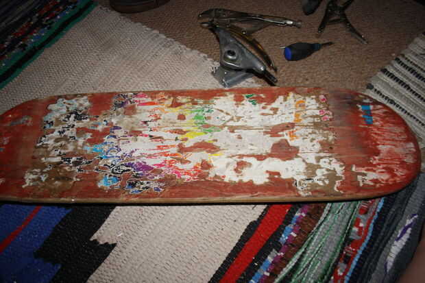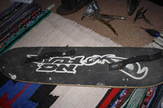 Teniendo todo esto en su lugar puede empezar por tomar los camiones de una herramienta de abrazadera llave (si tiene tornillos alrededor de los tornillos). Después de quitar correctamente los proceder a sacar los tornillos, dejando los camiones atornillado y listo para el elástico. Al hacerlo, usted puede comenzar a colocar el elástico en una postulación de pie de snowboard (así en la última foto). Y para el último bit, asegúrese el patín en una posición apretada, segura; conseguir un correcto montaje para el taladro que mantenga los tornillos en su lugar, y luego perfore dos tornillos a cada lado y hacer lo mismo con el otro. Para más seguridad puede perforar 4 más pequeños tornillos para que sea más seguro. Ahora su lista para destrozar algunas colinas nevadas.