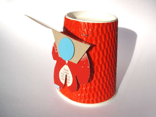 Al cortar el pico, asegúrese de que hay suficiente espacio para hacer un pliegue para el nuevo clip ir a través, como se muestra. Coloque el pico y zarzo a la taza de café usando una Makedo nuevo clip.