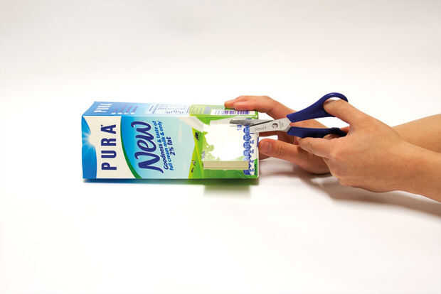 a continuación necesitamos hacer la ventana de visualización. Cortar un cuadrado de 50 x 50 mm en la parte inferior de la caja de leche.