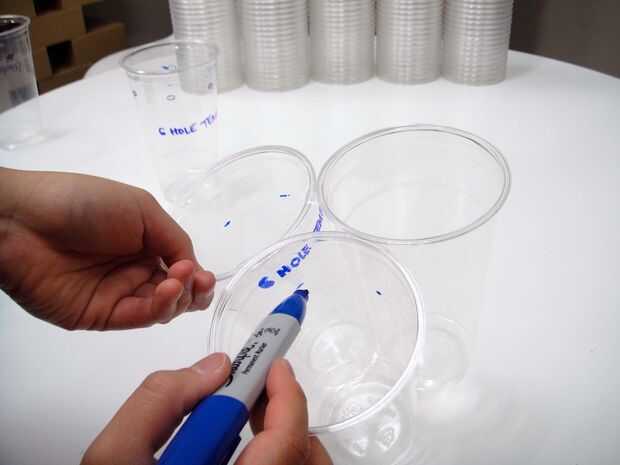 Para obtener los puntos para la plantilla de 3 orificios, coloque dos tazas al lado de la plantilla de base alineada con los puntos. Marque el punto donde el punto está situado en una de las tazas sin marcar. Una misma copa marca el punto donde toca la segunda Copa sin marcar.