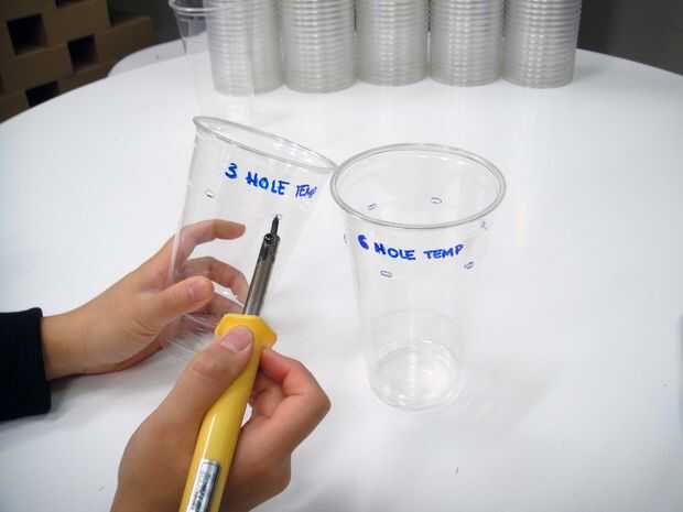 Usar el soldador y hacer agujeros en los puntos dibujados lo suficientemente grandes como para caber un alfiler de makedo a través.
