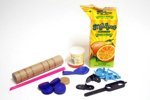 Materiales de alrededor de su hogar de origen. Utilizamos una caja de jugo reciclada como la base, algunas pajas y un tubo de papel para las velas. Pero se puede hacer con algo tan creativo get!