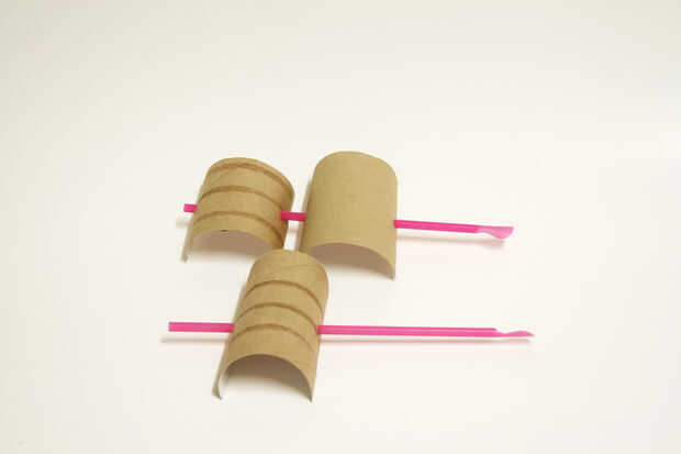 Para las velas, vio un tubo de papel por la mitad y luego longitudinalmente y plana. Nuestro barco pirata tiene tres velas. Use el punto final de la Sierra de segura para perforar dos agujeros en cada uno de vela en la parte superior y uno en la parte inferior de cada pieza. Ahora puede enhebrar una paja a través de los agujeros.