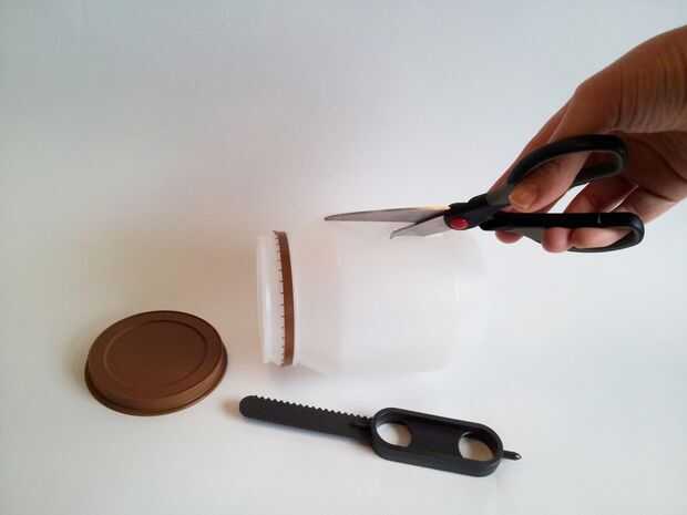 Primero de debe cortar una ranura en su tina de yogur para las monedas. Coloque la bañera en su lado y corte en lo que hoy es la parte superior. Utilizamos un envase de yogur, así que es fácil salir después las monedas (también a ser capaces de conseguir nuestra mano dentro para sujetar las piernas).