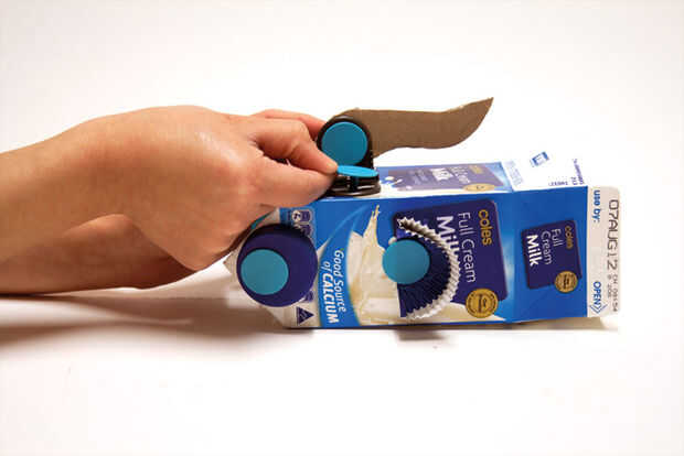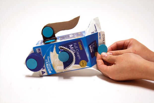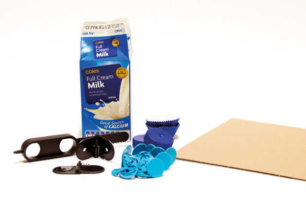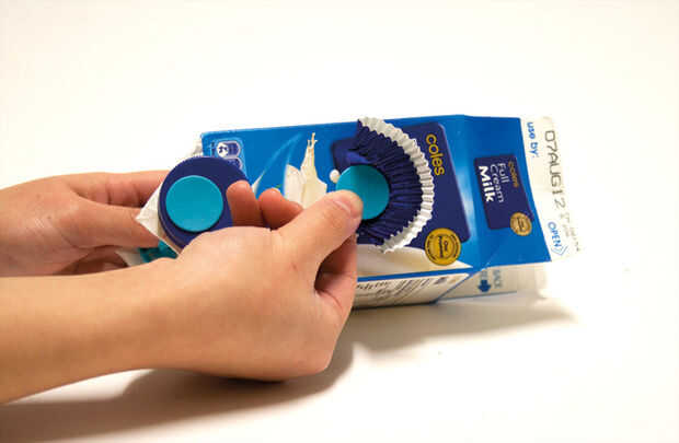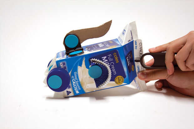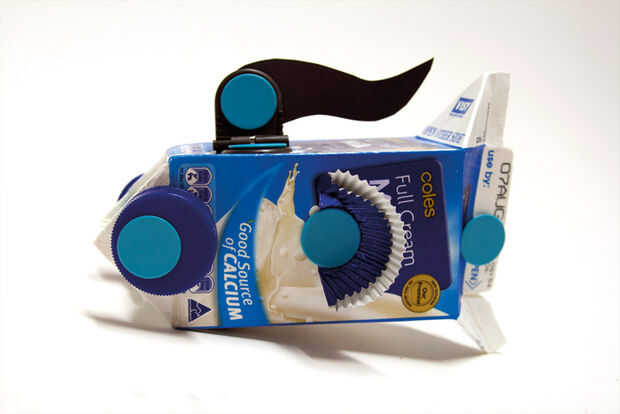 Reunir a un cartón de leche, tapas de botellas y materiales coloridos o brillantes como papel para horno. Adjuntar junto con nuestro fácil de seguir las instrucciones y piezas de Makedo de mymakedo.com